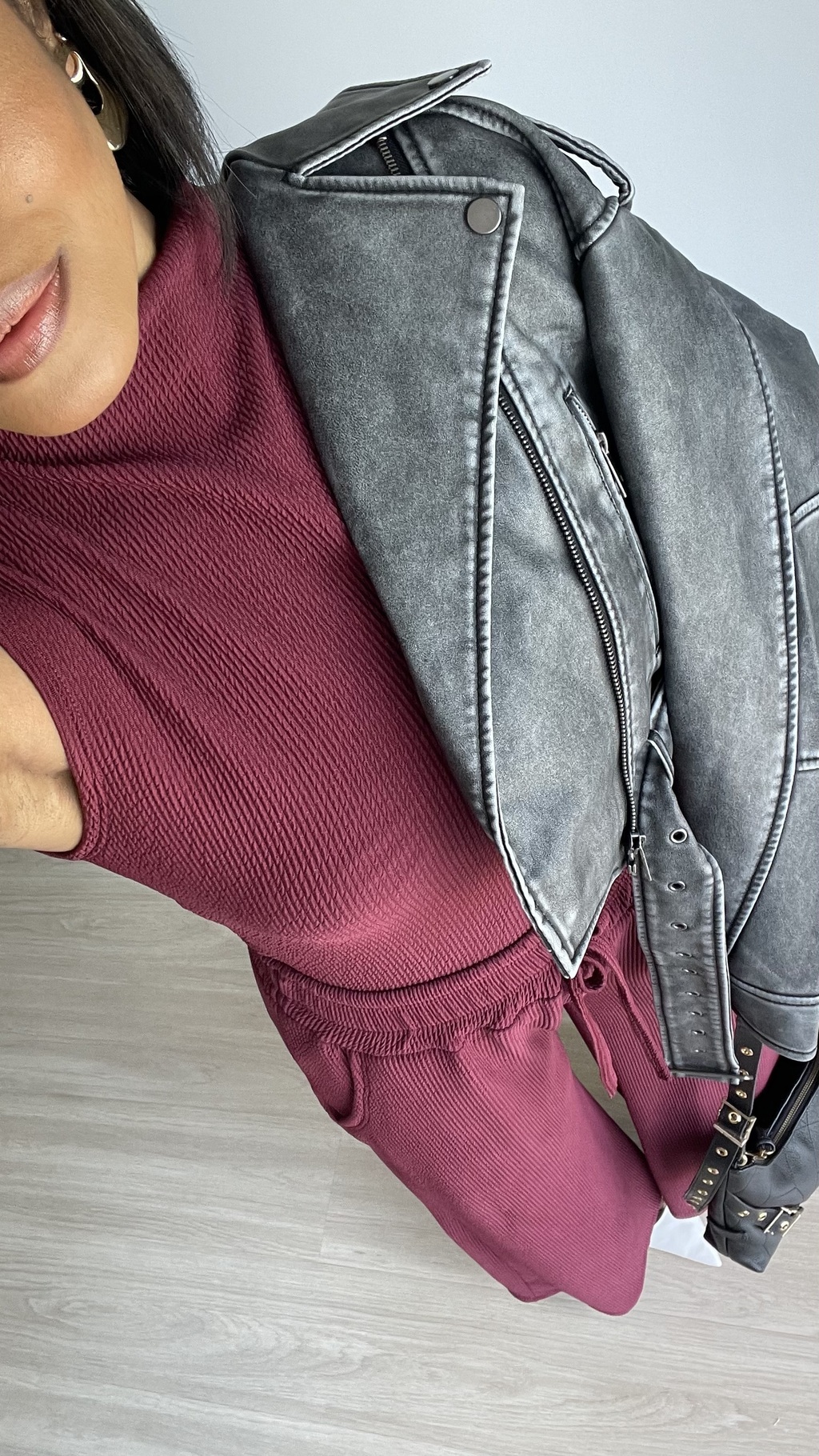 Conjunto de calça e blusa, em malha canelada texturizada. Calça com elástico na cintura.