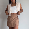 Mini saia em linho, com bolso cargo e fechamento com argolas. Zíper na lateral.